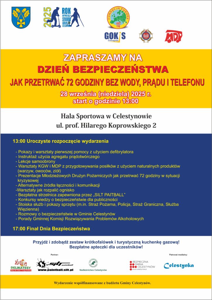 Tegoroczne wydarzenie odbędzie się pod hasłem: „Jak przetrwać 72 godziny bez prądu, wody i telefonu” W programie znajdziecie m.in.: Pokazy ratownictwa i pierwszej pomocy z użyciem defibrylatora, Pokazy filtrowania wody i rozpalania ogniska, Warsztaty z samoobrony, Bezpłatna strzelnica dla mieszkańców, „Kryzysowe gotowanie” przygotowane przez Koła Gospodyń Wiejskich z Gminy Celestynów, Prezentacje Młodzieżowych Drużyn Pożarniczych, Konkursy edukacyjne dla mieszkańców, Wyposażenie apteczki kryzysowej – co warto mieć pod ręką?, Wystawy sprzętu służb – m.in. Straży Granicznej i Służby Więziennej
